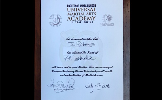 In 2013 Tim received his certification to teach Small Circle Ju Trap Boxing, and became the first affiliate school of Universal Martial Arts Academy. Dynamic Small Circle Ju Trap Boxing was developed by Grand Master James Hundon as a synthesis of his extensive experience in the martial arts, the security industry, and training law enforcement professionals.